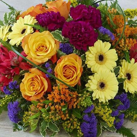 A vibrant posy featuring germini, roses, carnations and alstroemeria in rich shades.