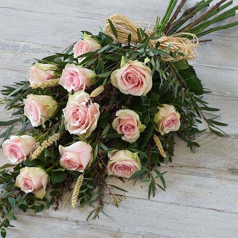 A dozen roses contrast beautifully with silvery eucalyptus foliage and natural elements including dried wheat, natural birch and a raffia bow.