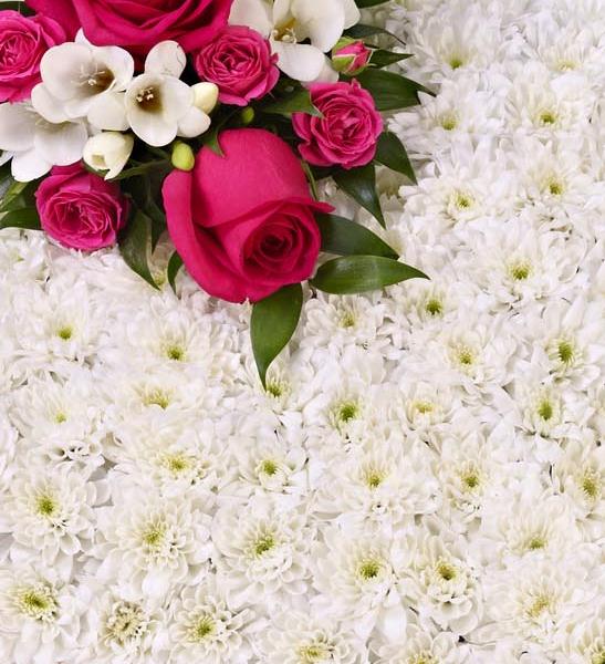 A classic cushion-shaped design created using a mass of white double spray chrysanthemums and finished with a spray of cerise roses and white freesias and a pink ribbon trim.
