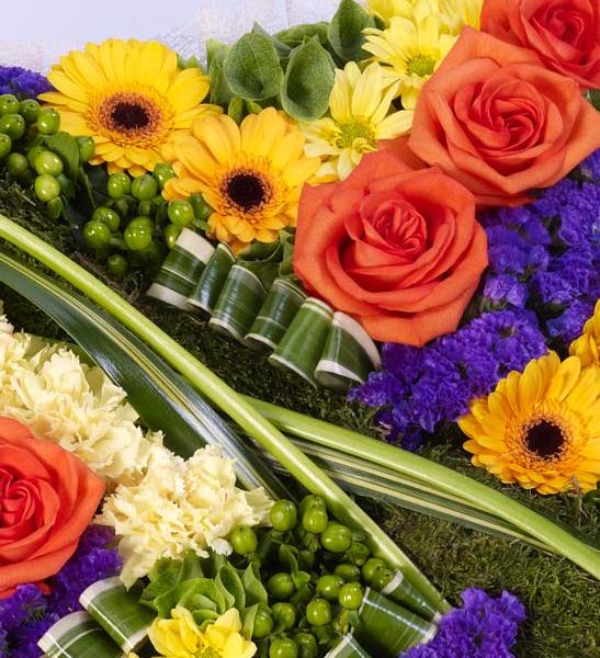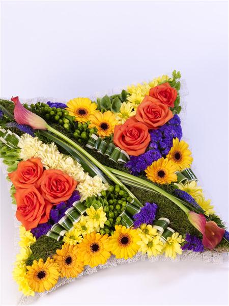 This striking contemporary cushion-shaped design features a selection of flowers in vibrant yellow, orange, purple and pink and includes roses, germini, carnations and statice. The design is completed with sweeping calla Lily and veronica.