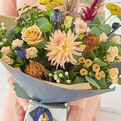 This handcrafted trending bouquet made by a local florist, will feature gorgeous blooms, foliage and dried flowers in muted colours like terracotta or silvery green.