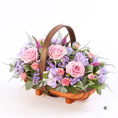 A traditional trug basket in pinks and lilacs. flowers may vary