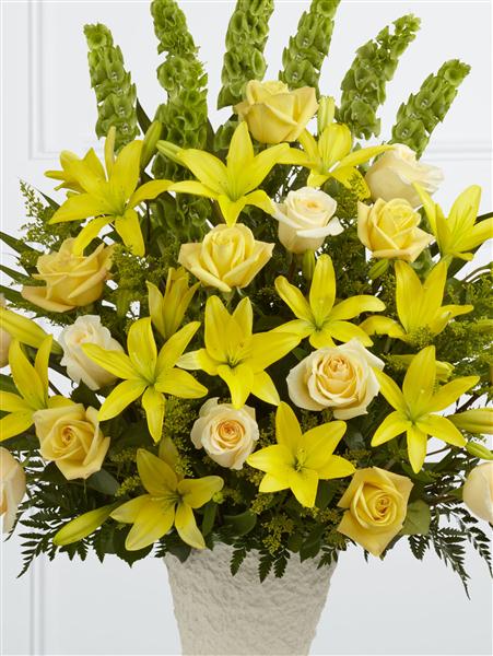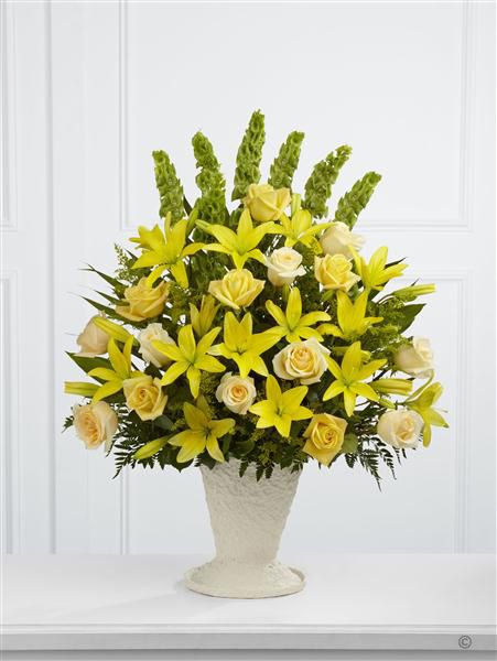 Yellow Asiatic Lily, roses and solidago are offset by cream roses, molucella, palm fronds and choice foliage to create a vibrant display. Arranged in a container ( may vary to picture), this beautiful display will make a lovely addition to the service.#=