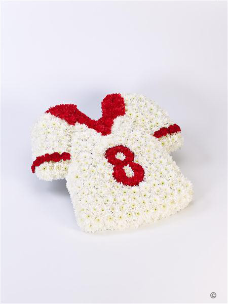 Double spray chrysanthemums and spray carnations are used to create this red and white football shirt design.