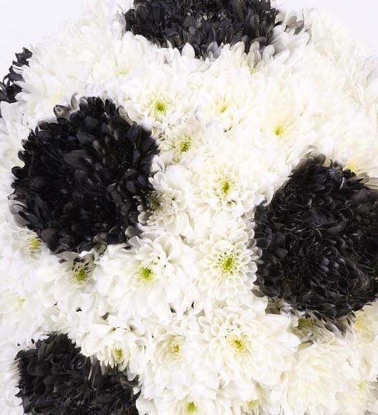 A mass of white double spray chrysanthemums are used in this football-themed three dimensional tribute, with some sprayed black to create the distinctive pattern. The football is then displayed on a moss-covered base.PLEASE ALLOW 10 DAYS NOTICE