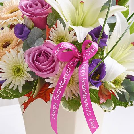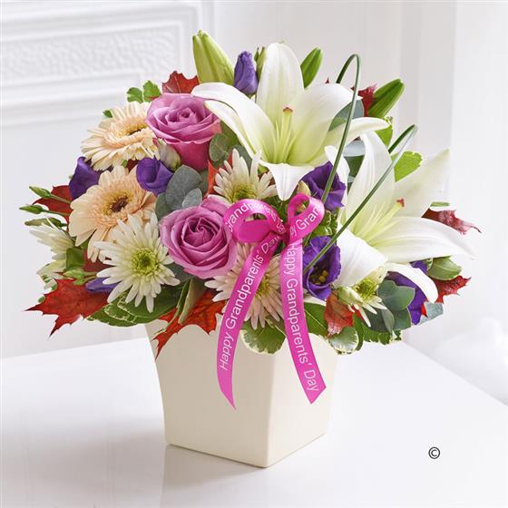 Spoil them this Grandparents’ Day with a stylish floral arrangement in soft shades of cream, lilac, peach and purple. There is plenty here for them to admire, and they’re sure to notice these stunning, velvety lilies and luxurious large headed roses. Simply stunning.