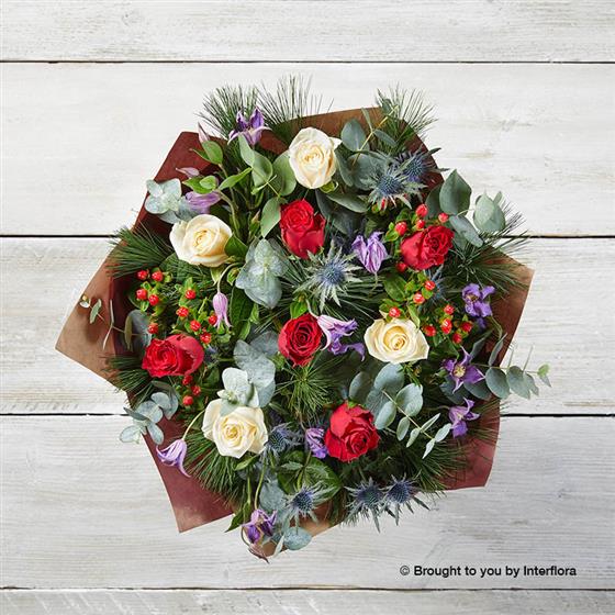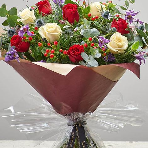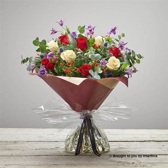 Red large headed roses, cream large headed roses, red hypericum, purple clematis and eryngiums with pine and eucalyptus, hand-tied, wrapped and presented in Jemini gift packaging.