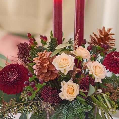 A gorgeous selected of fresh festive flowers, arranged by a florist around a red candle, ceramic bowl.