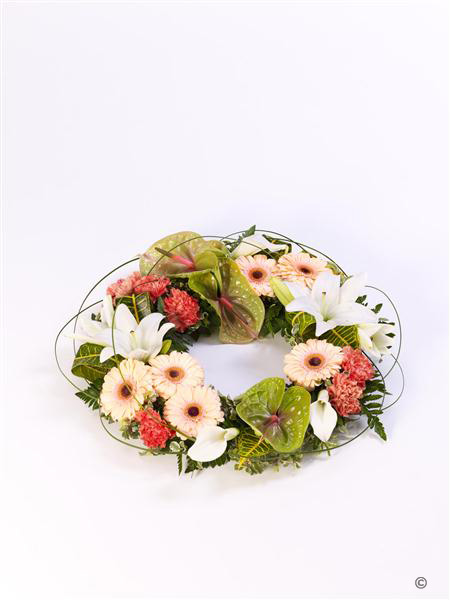 An elegant wreath featuring an exotic mix of anthuriums, calla Lily, Gerbera, Lily and carnations in green, orange and white. Tropical foliage and looped steel grass give it a contemporary feel. Approximate diameter 55cm (21 inches).
