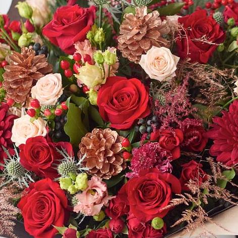 One of our bigger festive bouquets, this one is a stunning arrangement of fresh Christmassy flowers, expertly chosen by a local