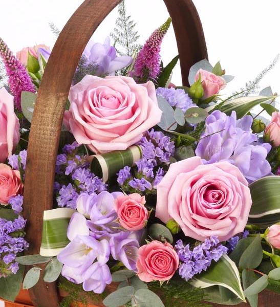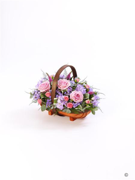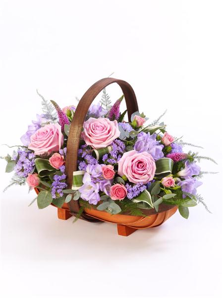 A traditional trug basket filled in pinks and lilacs. flowers may vary