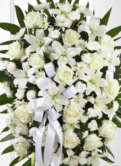 This exquisite spray in white and green includes roses, Asiatic Lily, spray chrysanthemums and spray carnations arranged amongst palm fronds and lush greens. Accented by white satin ribbon, this spray will make a truly beautiful addition to the service.