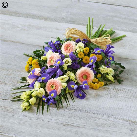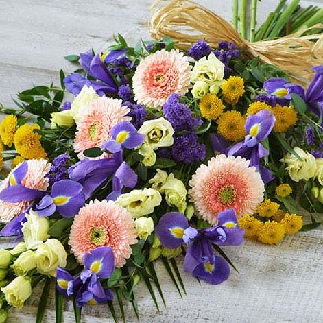 A delicate array of yellow, blues and peach featuring irises, chrysanthemums and germini.