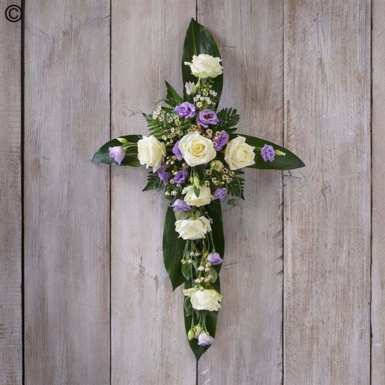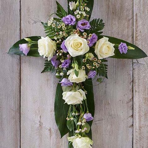 A beautiful lilac and white cross featuring roses, lisianthus and eucalyptus.