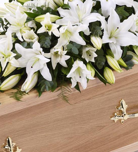 A blanket of white Oriental Lily is beautifully complemented by an array of luxurious deep green leaves to create this simple but striking casket spray. Approximate height 122cm (4ft). please allow 7 days notice