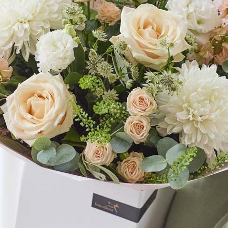 A soothing bouquet of gorgeous neutral flowers, expertly arranged by a skilled local florist. It’ll feature fresh foliage contrasted with cream or white flowers. Exactly which blooms will depend on what’s freshest and the occasion – every bouquet is beautifully unique, made bespoke.