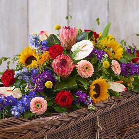 Tropical blooms in vibrant shades, including protea and anthurium, meet lush foliage and sunflowers in this beautiful casket spray.
