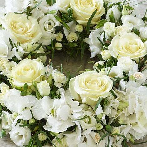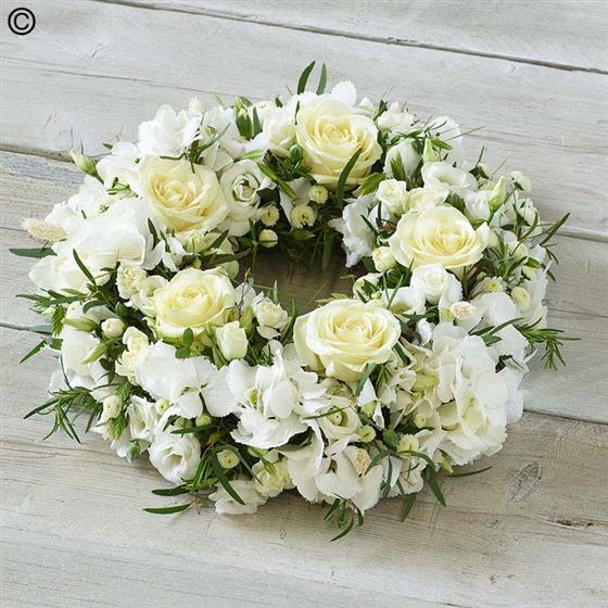 A profusion of white blooms, this elegant wreath features the finest hydrangeas, fragrant rosemary and dried lagarus 'bunny tails'.