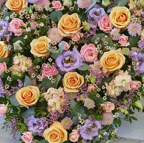 A heart tribute of pretty pastel shades featuring roses, limonium, chrysanthemum and fragrant stocks.