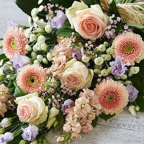 An abundance of blush pink blooms featuring fragrant peach stocks, pale pink roses and lilac lisianthus.