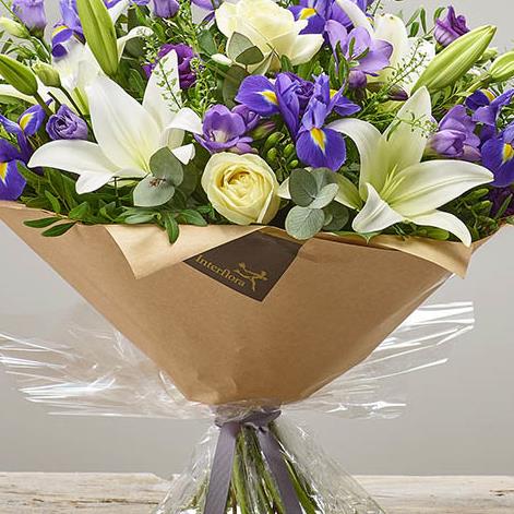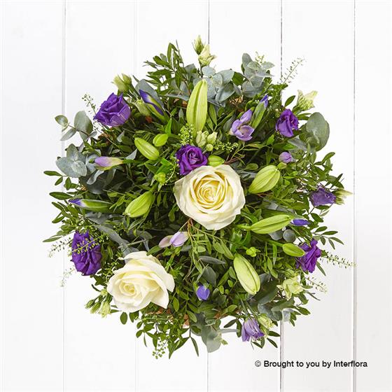 An elegant hand-tied to send a thoughtful gift during times of sorrow. Our beautiful Purple Comfort Hand-tied has been carefully designed by florists in soft white and pretty purple shades.