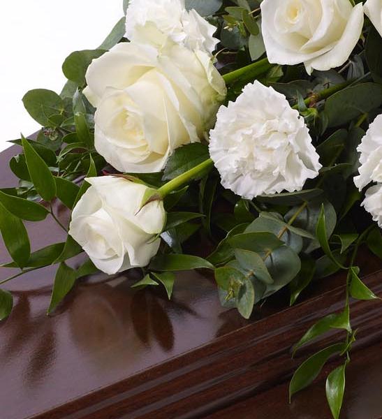 Large-headed white Rose combine with white carnations and luxurious foliages to create this traditional casket spray. Approximate height 92cm (3ft).