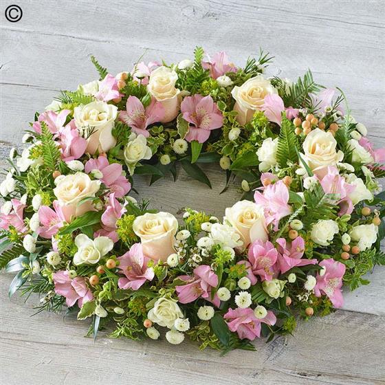 A beautiful pastel mix of soft pink, peach and cream. Featuring roses, chrysanthemums and delicate foliages.