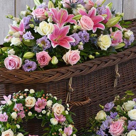 A collection of some of our most popular tributes - a casket spray, wreath and posy. Each features beautiful blooms in pastel tones including roses, lilies, stocks and more.