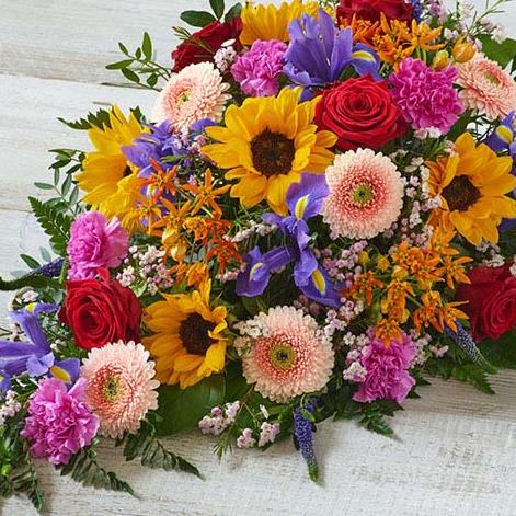 A beautiful, vibrant teardrop shaped mix featuring sunflowers, irises and germini. PLEASE ALLOW 5 DAYS NOTICE