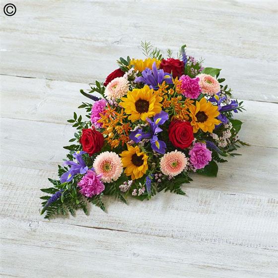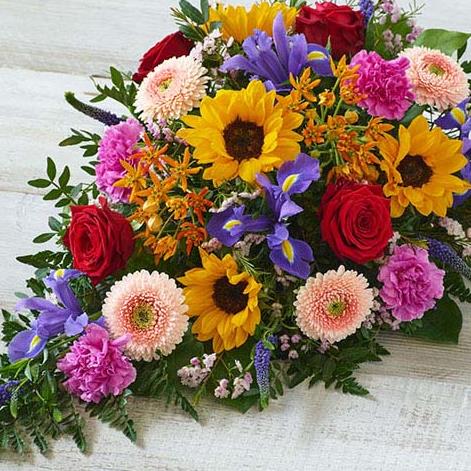 A beautiful, vibrant teardrop shaped mix featuring sunflowers, irises and germini.