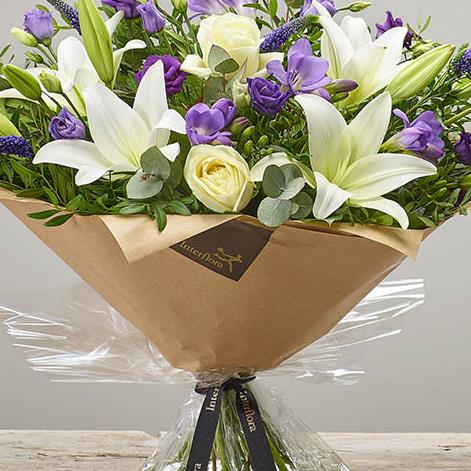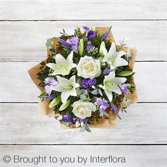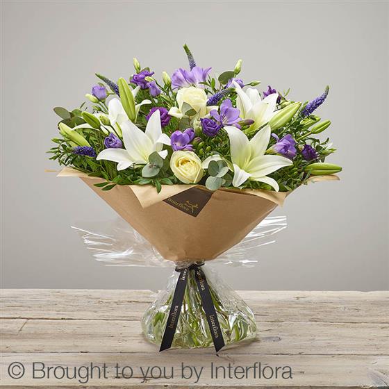 Featuring white LA lily, ivory large headed rose, purple freesia, blue veronica, purple lisianthus, eucalyptus & pistache, presented in Interflora gift packaging.