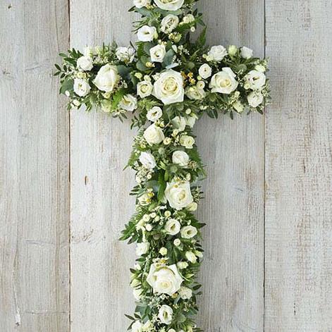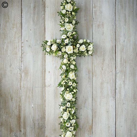 An elegant cross that contrasts an array of white blooms, including roses, chrysanthemums and limonium, with beautiful foliage.