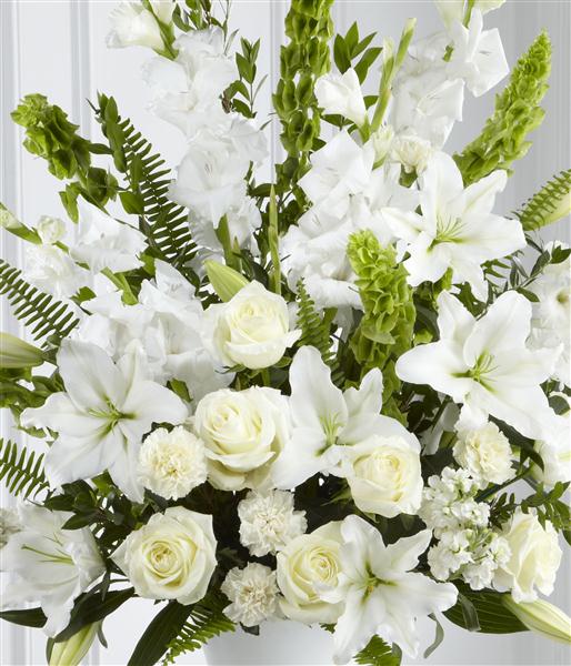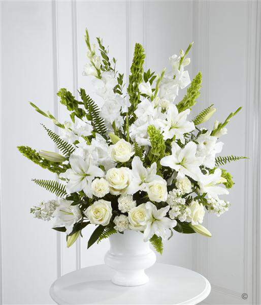 This stunning urn arrangment is a beautiful expression of peace and soft serenity. White roses, carnations, gladioli, stocks and Oriental Lily are accented with the bright green Stems of molucella and an assortment of foliage.FLOWERS MAY VARY DUE TO SEASON and container
